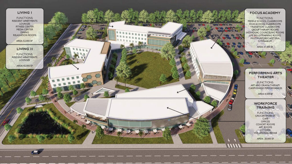 The proposed Project Focus campus is designed to activate every aspect of independent living and personal fulfillment. Rooted in connection and opportunity, this campus will not only serve the individuals enrolled in our programs, it will invite the broader public to engage and invest in what inclusion can truly look like.